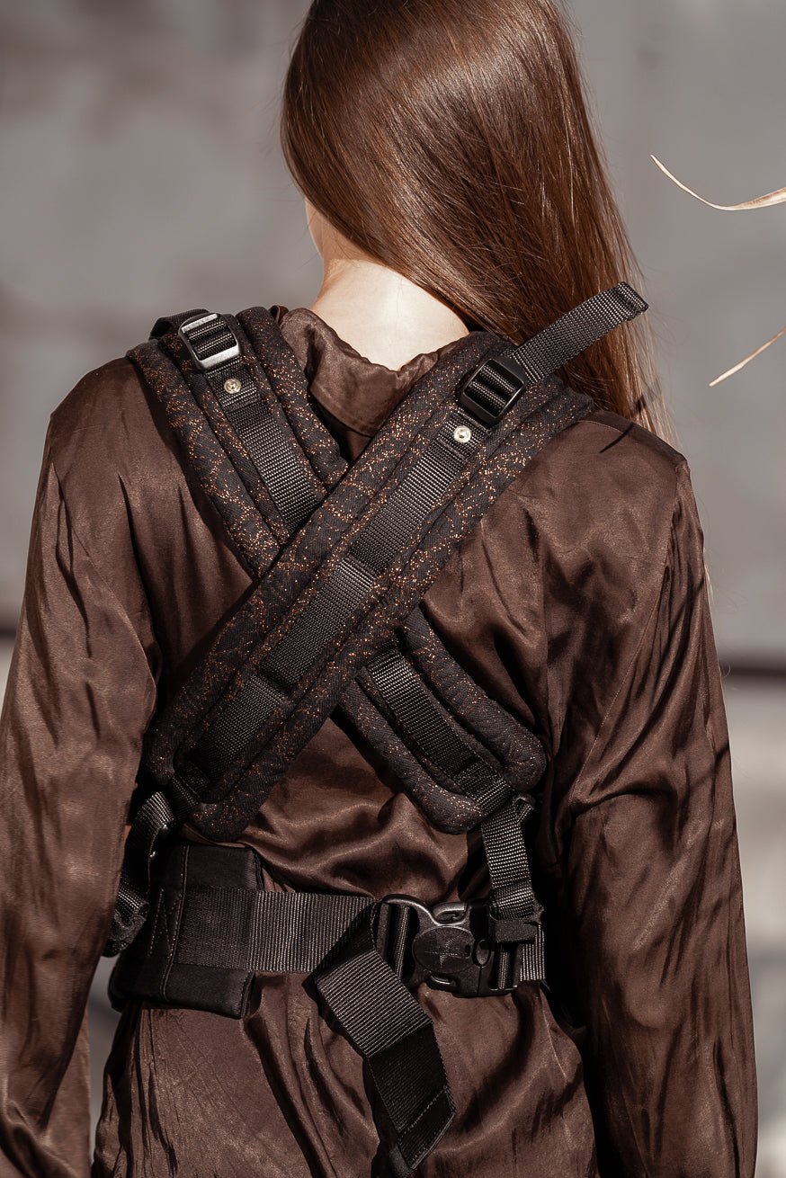 Ein Glanzmoment für Eltern, die Schönheit und Komfort lieben. Das Rückenpanel aus Tragetuchstoff passt sich Wirbel für Wirbel an – ohne Polsterung, ohne Druckpunkte.