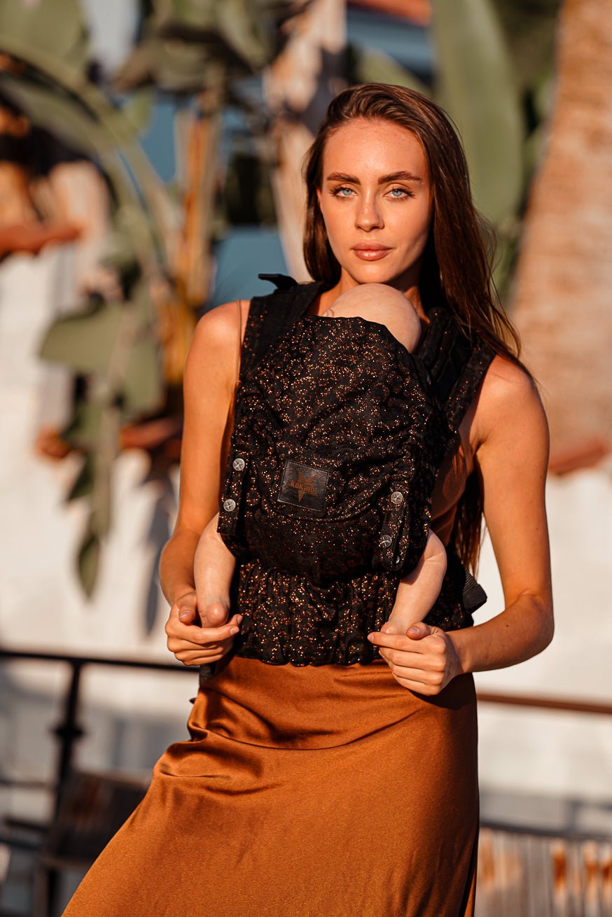 Diese Babytrage ist besonders anpassungsfähig – mit überkreuzbaren Trägern für deinen individuellen Komfort und einer stufenlos verstellbaren Stegbreite, die mit deinem Baby mitwächst. Und dann dieses Design: Safari Shine – ein schimmernder, bronzefarbener Traum auf dunklem Grund. Fast wie die Glut eines Lagerfeuers unter afrikanischem Sternenhimmel. Der Stoff gleitet über die Haut wie Wasser – weich, anschmiegsam und dennoch stützend. Du spürst die Qualität, du spürst die Geborgenheit. Und du wirst gesehen – denn dieser Flip X ist nicht nur funktional, er ist Statement.