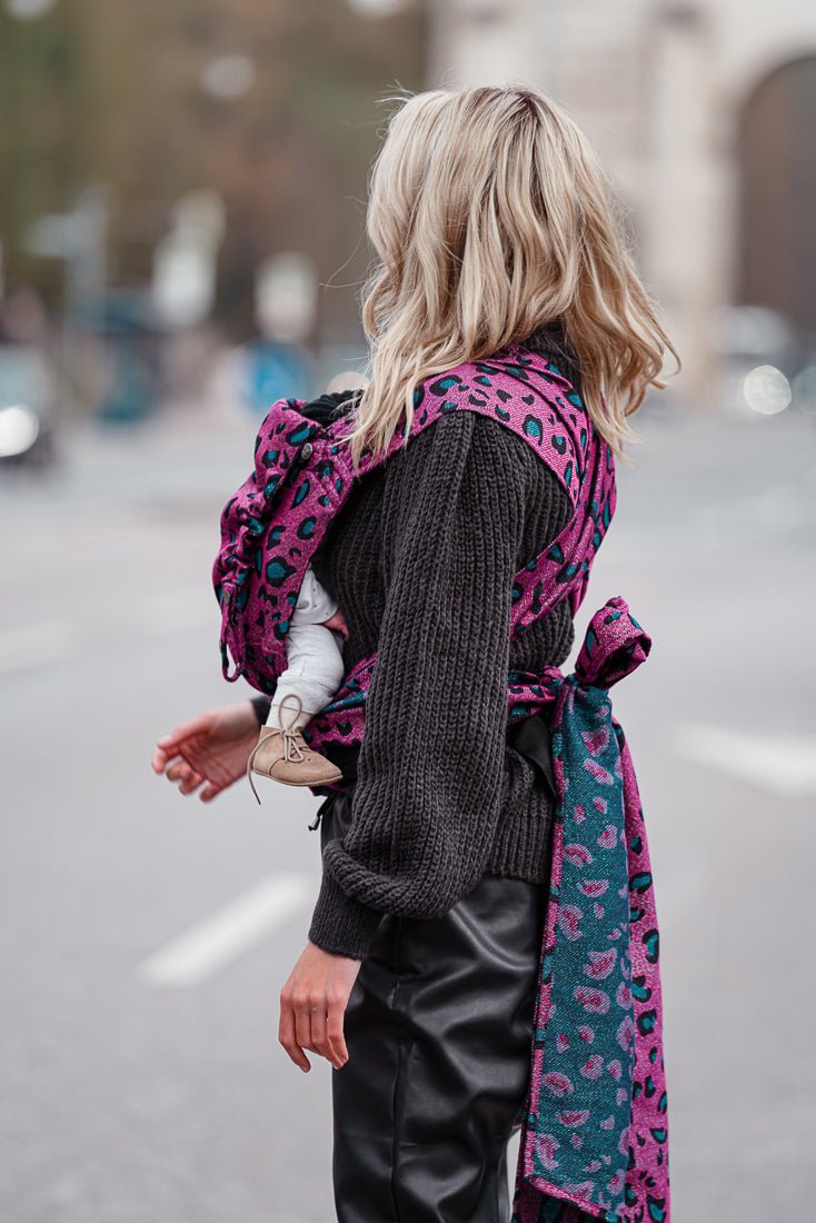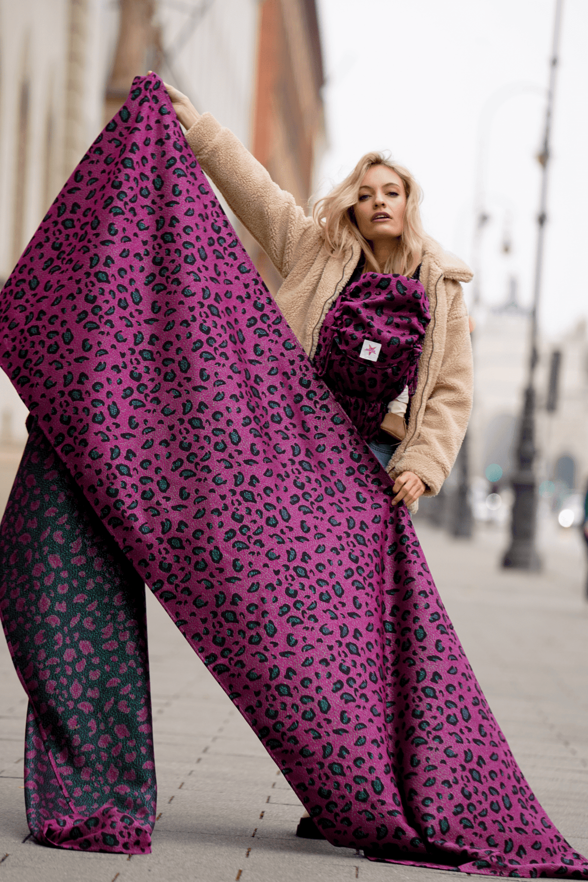 Silky, flowing fabric and a trendy leopard print in bright pink that is interspersed with sparkling green glitter threads. This one Baby Carrier will make your heart beat faster - that's Safari Caspar!