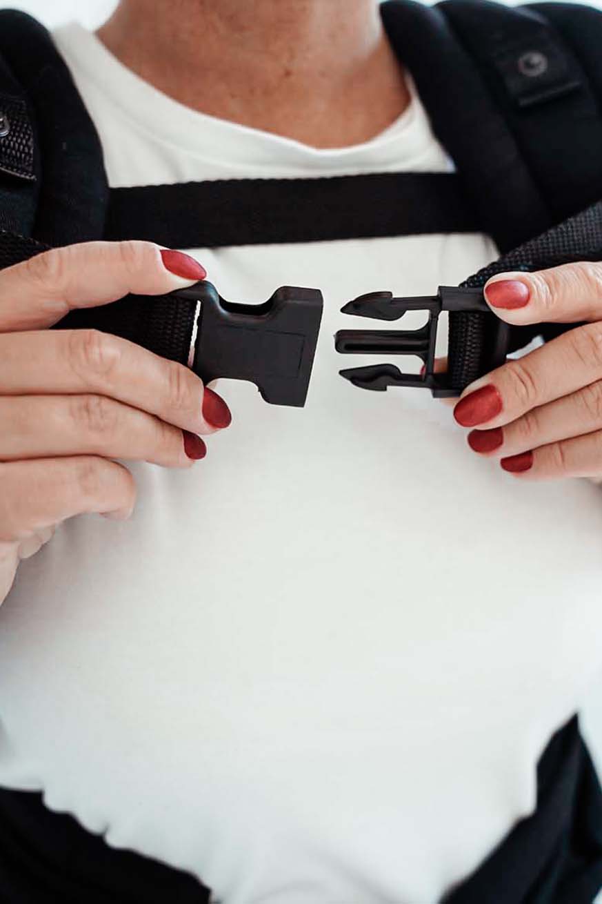 Specially designed to be worn on your back with ours KOKADI Halfbuckle Baby Carriers like TaiTai, WrapStar and WrapTai, we designed our chest strap with a buckle. This distributes your baby's weight even better and prevents the straps from slipping over your shoulder. Put on your baby carrier as usual and tighten it. The chest strap is then pulled through the straps and fastened in front of the chest using the buckle.