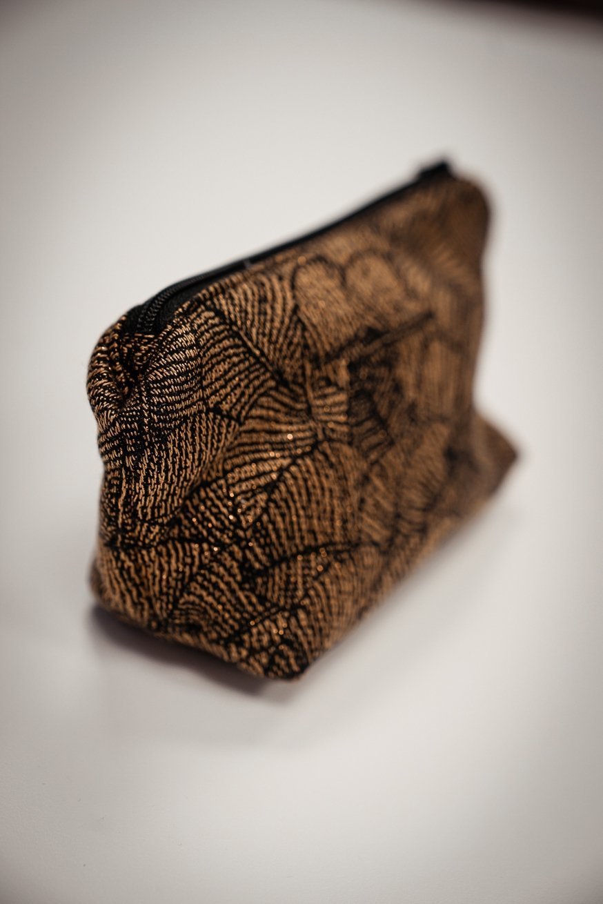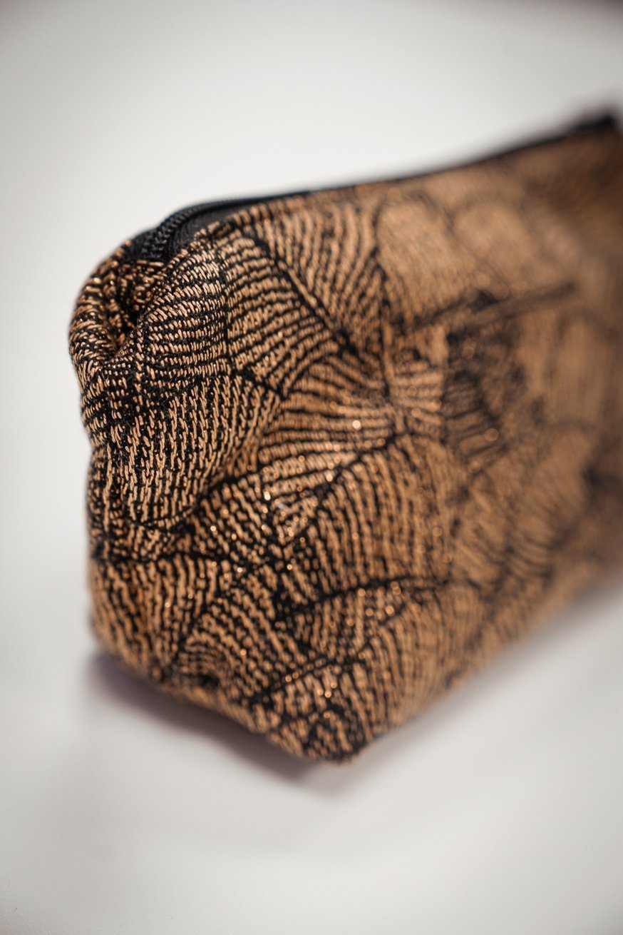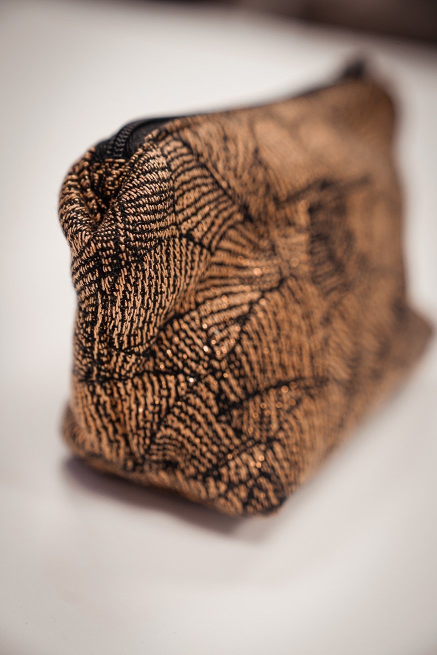The KOKADI Cosmetic bag - of course made of sling fabric. Enchanting feathers, on a magical gold background. Our Leaves Lynne design really captivates everyone.