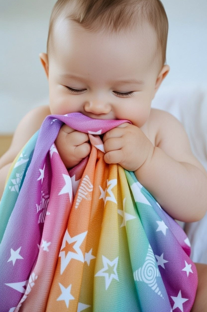 Whether as a sleeping aid, comforter or to snuggle up in the baby carrier - our muslin snuggle cloth in the beautiful design Julia Stars is a faithful everyday companion for your baby. The particularly fine material mix of 55% viscose (from bamboo pulp) and 45% organic cotton ensures a robust and at the same time velvety soft surface for this one-sided printed muslin. Also as a small gift for the birth of the 50x50 cm large Schnuffeltuch is a sweet attention for the next baby visit to friends.